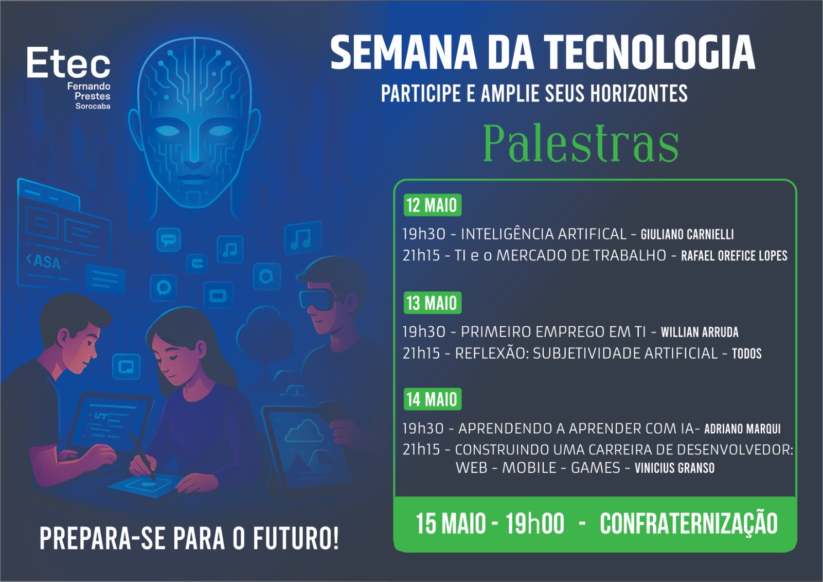 Nos dias 12/05 a 15/05 aconteceu a Semana de TI no período noturno na ETEC Fernando Prestes. O evento envolveu os alunos dos Cursos Técnicos em Desenvolvimento de Sistemas, Contabilidade e Recursos Humanos. A ênfase dos conteúdos das palestras foi Inteligência Artificial e tendências do Mercado de Trabalho.