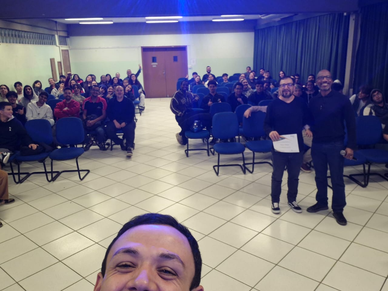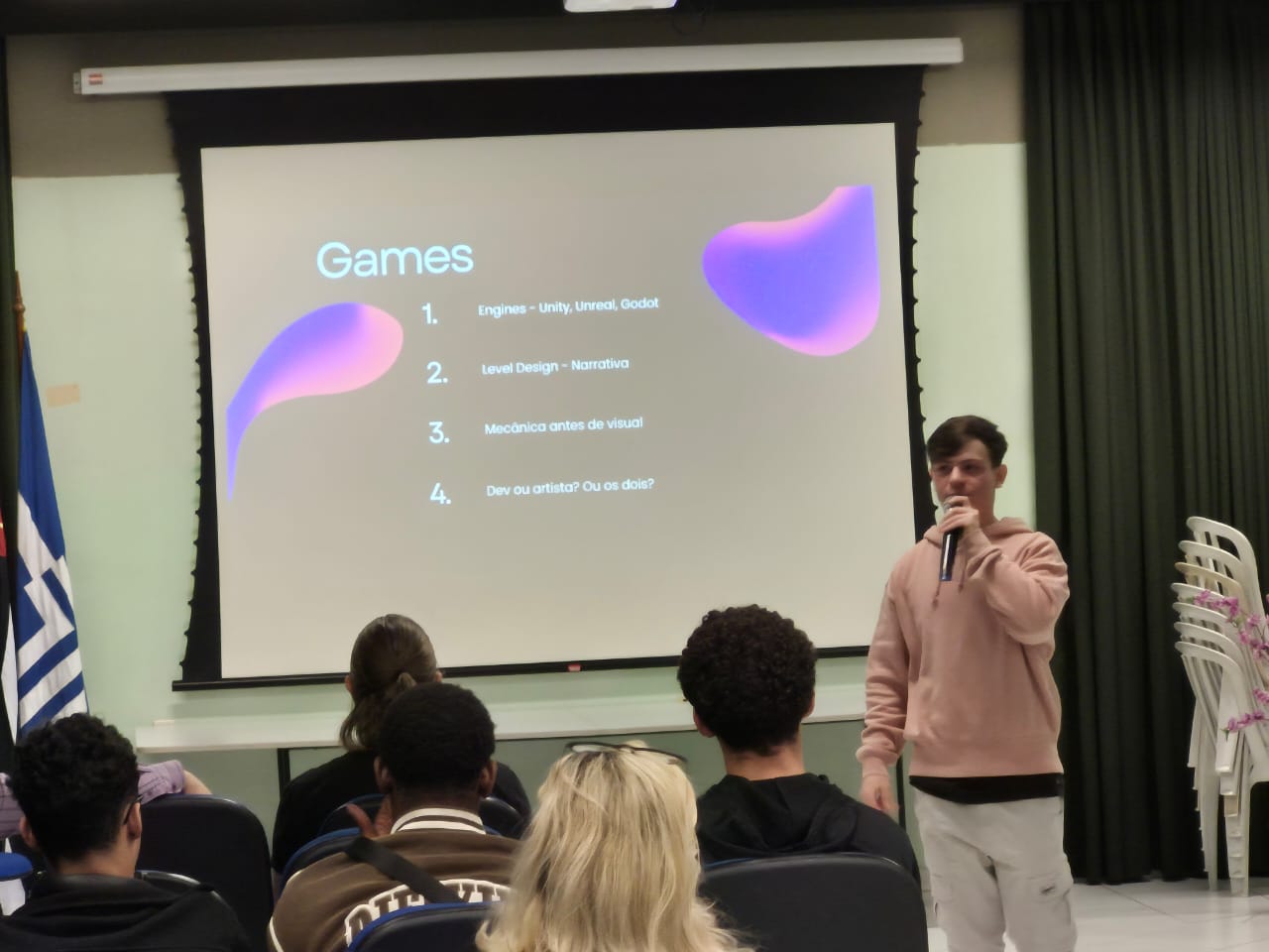 Após o intervalo, nosso ex-aluno Vinícius Granso, hoje com 22 anos e com experiência nas áreas de desenvolvimento de games, aplicativos mobile, páginas web, contou toda sua trajetória após terminar o curso na ETEC Fernando Prestes.